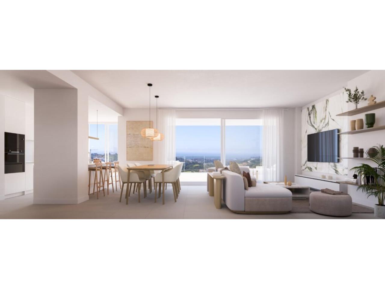 Un exclusivo conjunto residencial compuesto por 144 viviendas de 1, 2 y 3 dormitorios, distribuidas en seis edificios de baja altura. Su diseño vanguardista y moderno se integra perfectamente con el entorno natural, ofreciendo unas vistas espectaculares a la Bahía de Estepona y al campo de golf de Valle Romano. La orientación sur de las viviendas asegura que todas cuenten con una excelente luminosidad, aprovechando al máximo las horas de luz natural. Los amplios ventanales no solo permiten disfrutar de las vistas panorámicas, sino que también crean un ambiente luminoso y espacioso, ampliando la sensación de confort. Los salones, diseñados para crear una conexión fluida con el exterior, potencian la amplitud de los espacios. El residencial cuenta con una completa gama de servicios, incluyendo una piscina, un gimnasio interior y una sala gourmet. Además, los residentes pueden disfrutar de amplias zonas verdes con especies autóctonas que realzan la belleza natural de la zona. Garaje y trastero incluido en el precio CERTIFICADO ENERGETICO:E.