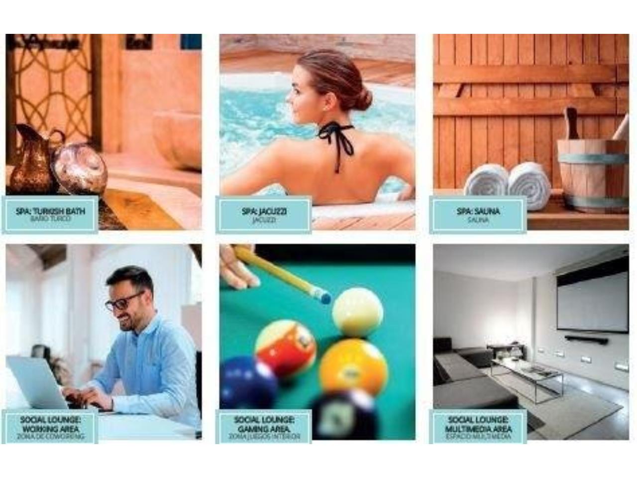 Un resort en tu propia casa con amplios jardines con piscinas de cloración salina, solárium, espacio de relajación y yoga, spa con baño turco, jacuzzi y sauna, área fitness interior, salón de ocio con zona de coworking, multimedia y juegos todo rodeado de zonas verdes con tratamiento paisajístico y