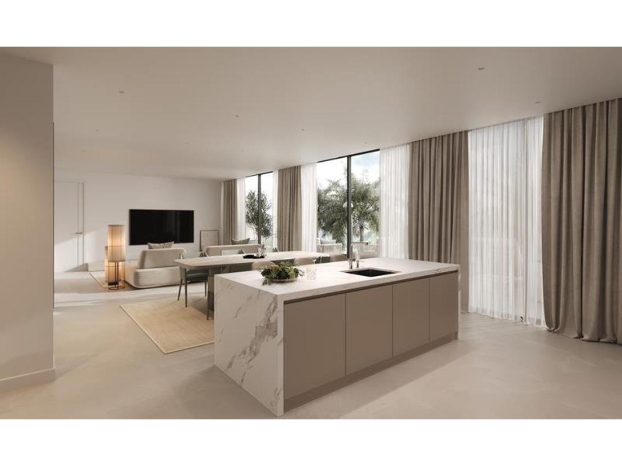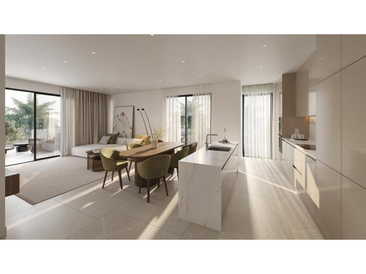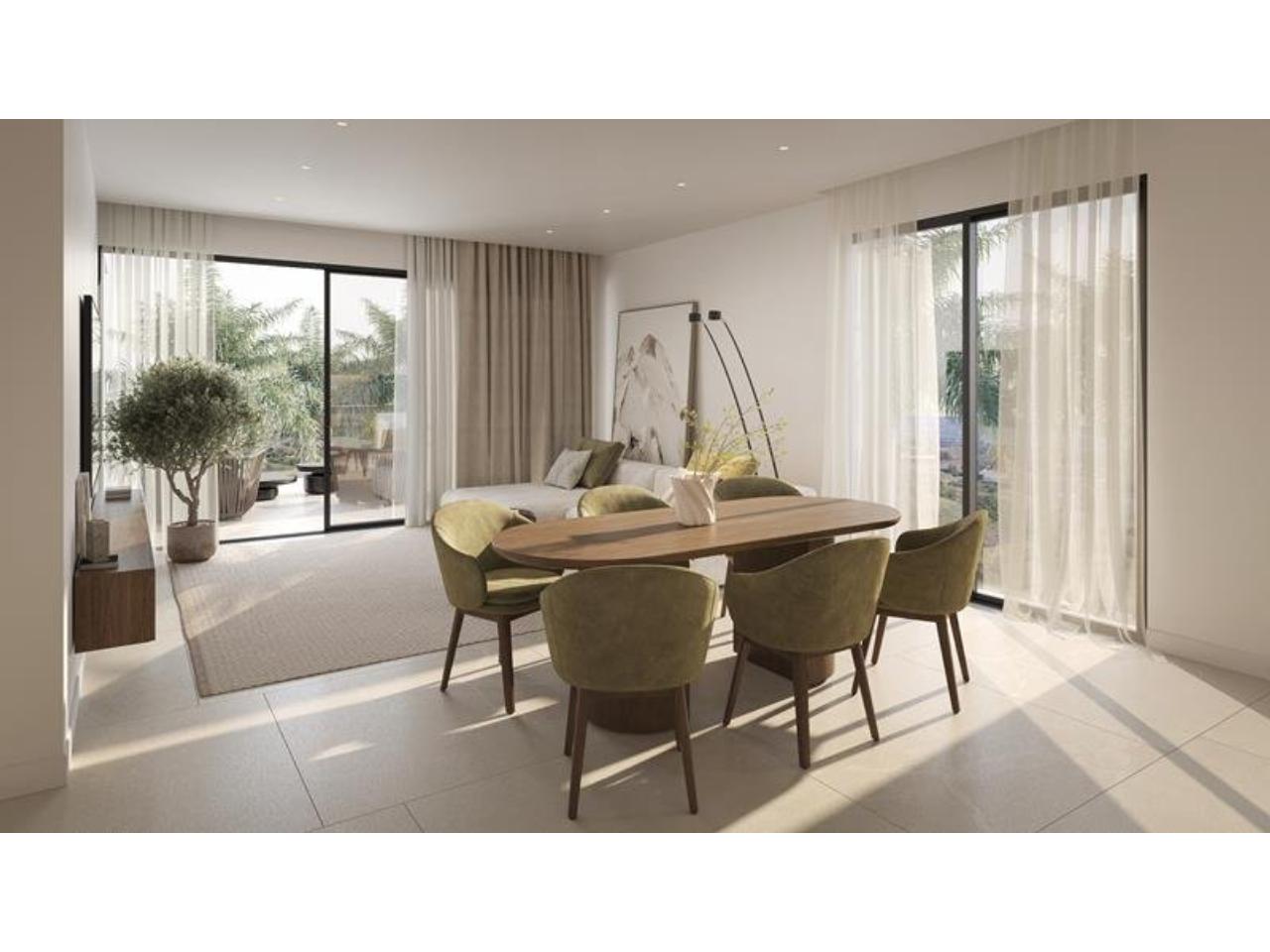 Diseño contemporáneo con grandes ventanas que para aprovechar al máximo luz natural. Salones con cocinas abiertas totalmente equipadas. Recinto cerrado con piscina y jardines.