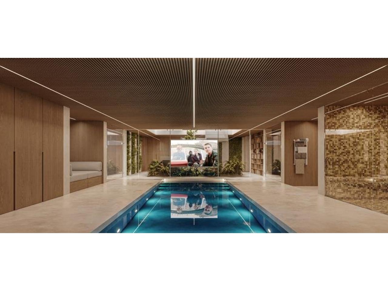 Cinema, gym, spa, 6 bedrooms, elevator, Jacuzzi, chill-out area, massage room, Big Green Egg BBG with original cabinetry, Villeroy & Bois, and Duravit. Outdoor infinity pool, heated indoor pool.